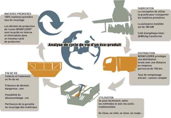 Bien que NOVAFLOOR® ne possède pas encore tout à fait le recul (premières plaques commercialisées en 1997), les produits commercialisés peuvent être considérés comme continuellement recyclable au sein de l’usine NOVAFLOOR® et la durée de vie globale des produits peut être fixée à plus de 30 ans.