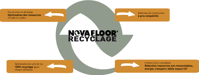 NOVAFLOOR® est une réponse efficace à la réduction des émissions des Gaz à Effet de Serre, à la raréfaction des matières premières et à la gestion d’un meilleur cycle de vie de nos produits.